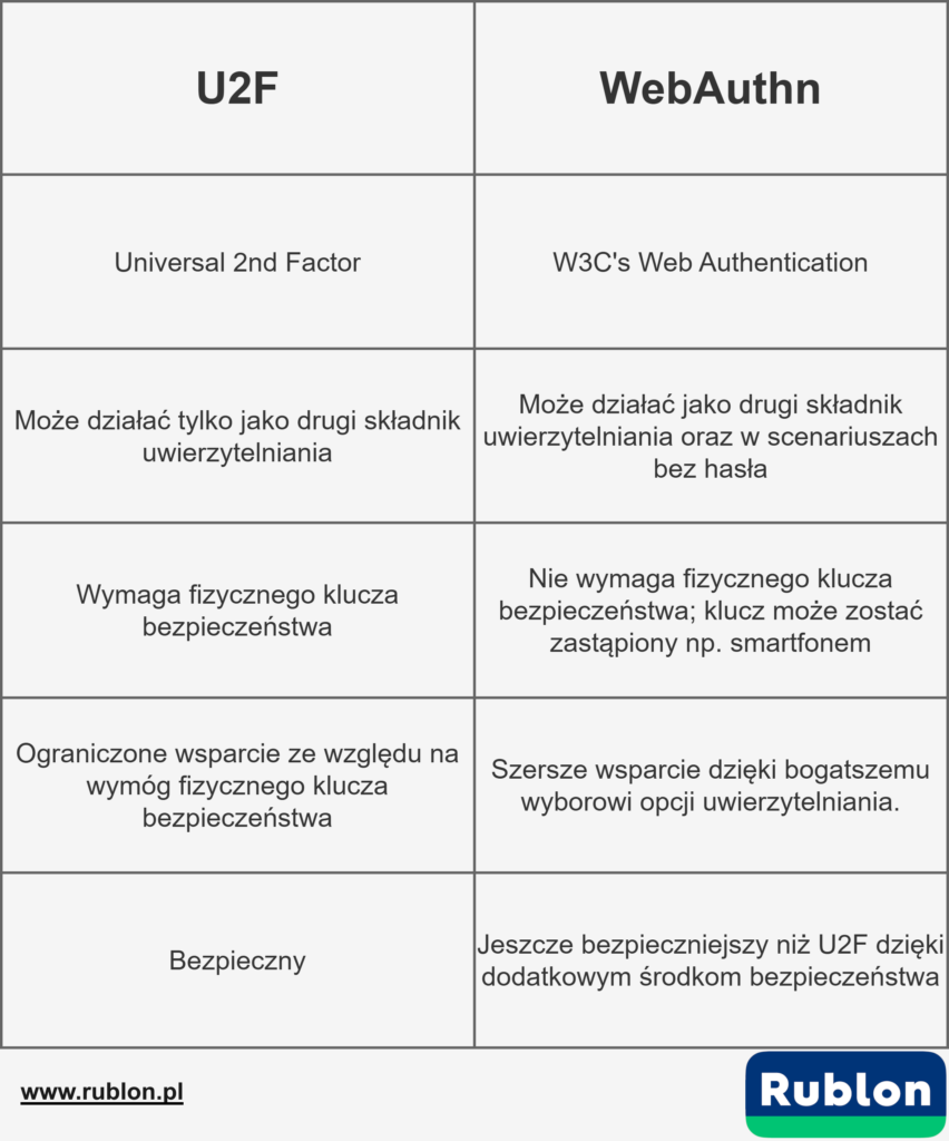 - Kompatybilność wsteczna. WebAuthn ma również tę zaletę, że jest wstecznie kompatybilny z U2F. Oznacza to, że większość stron internetowych i usług korzystających z U2F będzie w stanie obsługiwać WebAuthn po ewentualnych niewielkich modyfikacjach.