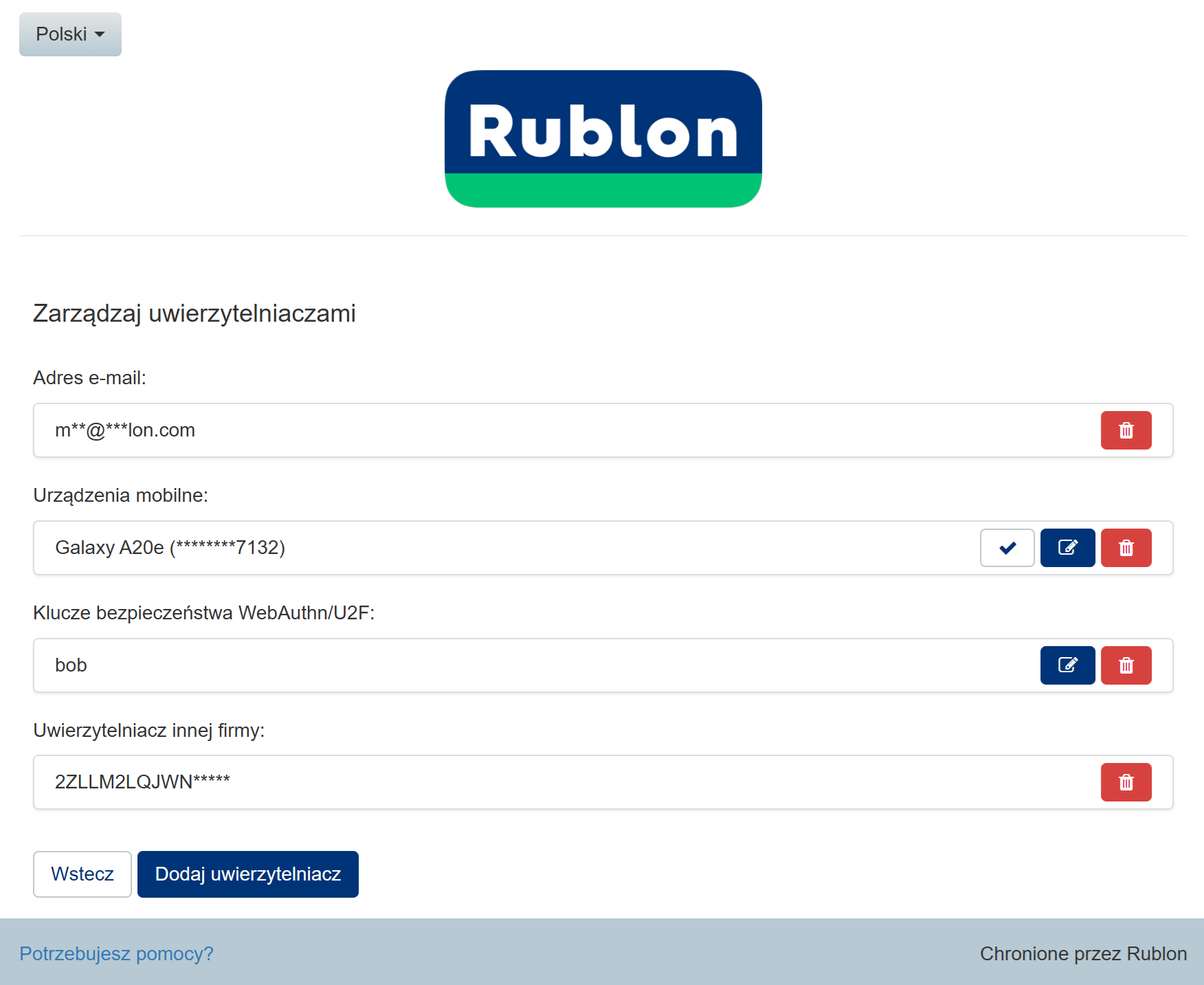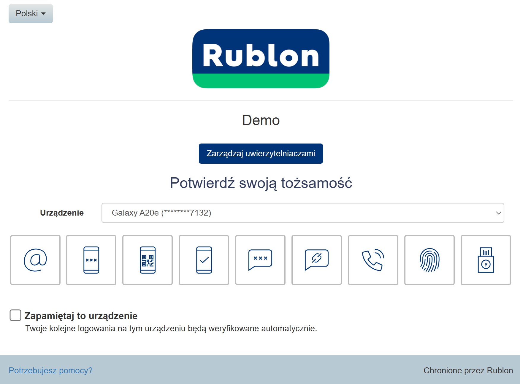 6. Po potwierdzeniu swojej tożsamości jedną z dostępnych metod (np. Powiadomienie mobilne), w widoku Rublon Prompt wyświetli się widok Zarządzaj uwierzytelniaczami.