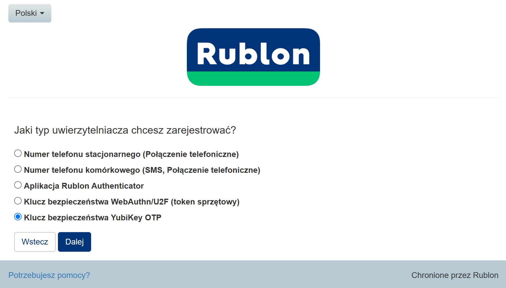 8. Wybierz Klucz bezpieczeństwa YubiKey OTP jako typ swojego uwierzytelniacza i kliknij Dalej.