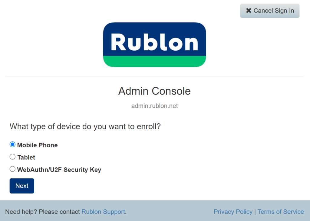 10. You will be asked to choose one of the available authentication methods to sign in to the Admin Console.