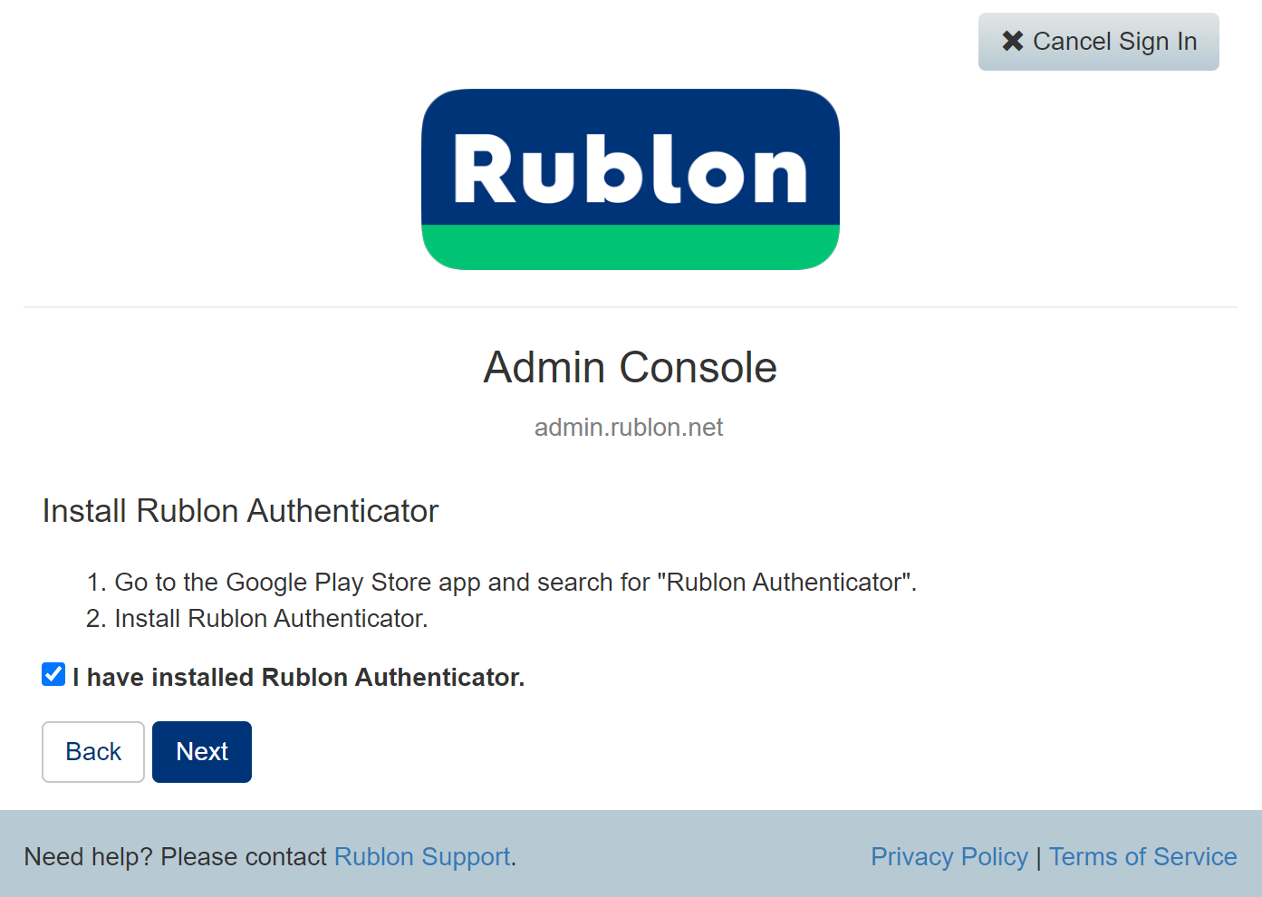 7. Since you already updated your Rublon Authenticator, check the I have installed Rublon Authenticator checkbox and click Next.