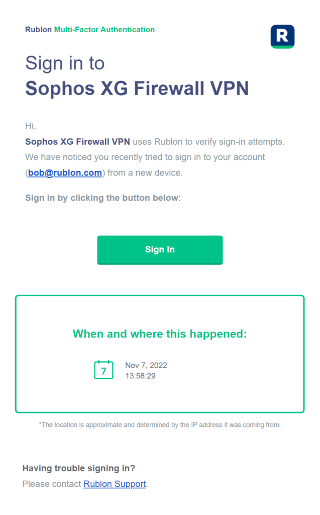 We are proud to announce that Rublon now enables Multi-Factor Authentication (MFA) for Sophos XG Firewall VPN logins. Users can safely connect to Sophos SSL VPN, Sophos PPTP VPN, Sophos IPsec VPN, Sophos Firewall User Portal, and Sophos Firewall web admin console using Mobile Push, Mobile Passcode (TOTP), and Email Link authentication methods.