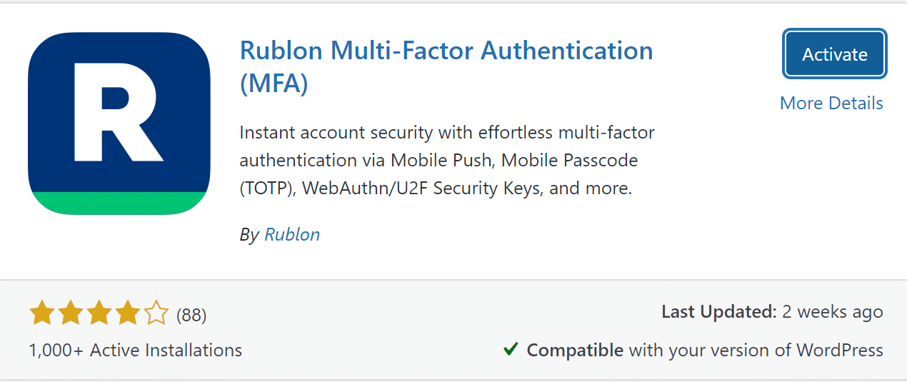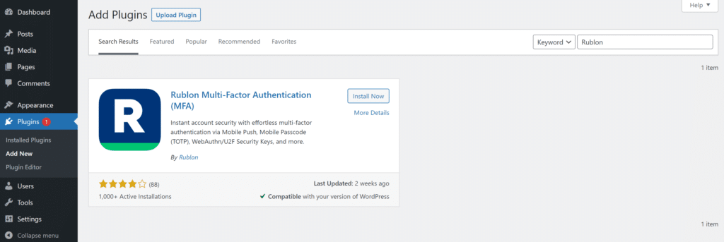 3. Click the Install Now button inside the Rublon plugin box in the search results.