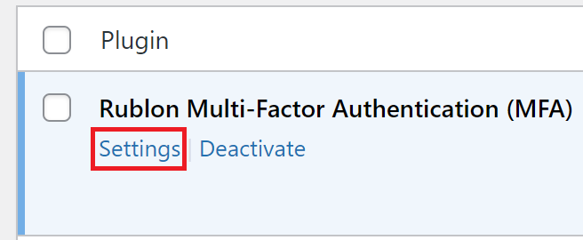 1. Click the Settings link in the Rublon Multi-Factor Authentication (MFA) box on the Plugins page.