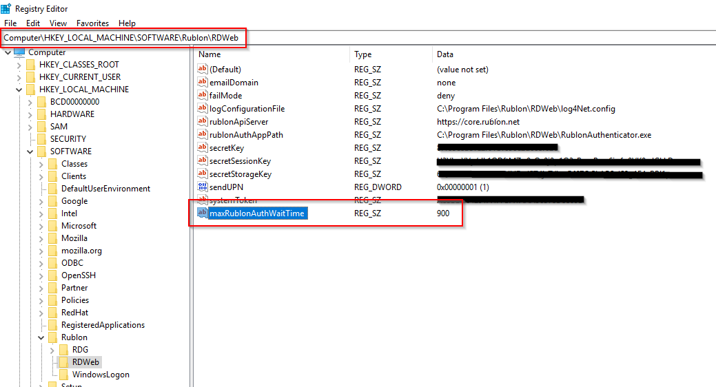 2. In Windows Registry, go to Computer\HKEY_LOCAL_MACHINE\SOFTWARE\Rublon\RDWeb and set the maxRublonAuthWaitTime key to 900.