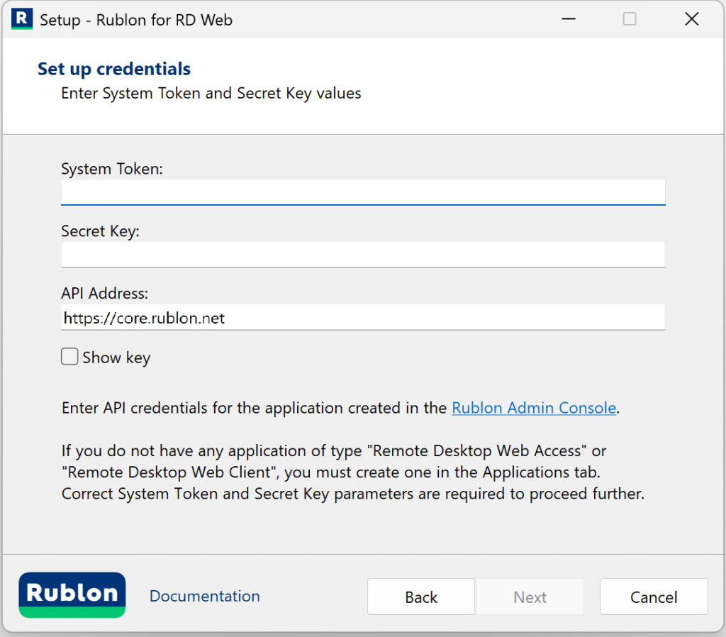 3. Enter the API credentials (System Token and Secret Key) from your application of type Remote Desktop Web Client in the Applications tab of the Rublon Admin Console and click Next.