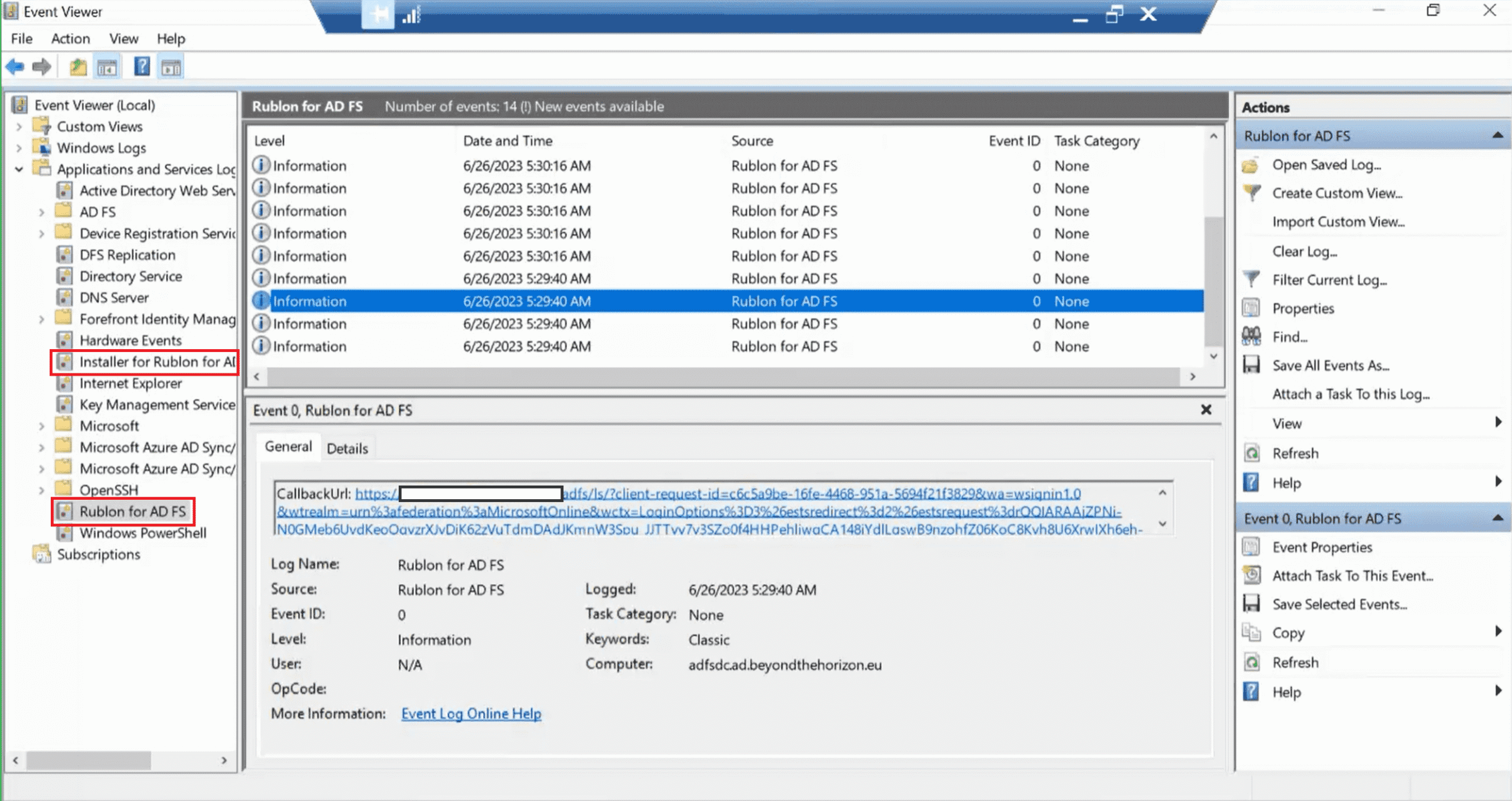 - Open the Event Viewer and go to Applications and Services Logs → Installer for Rublon for AD FS