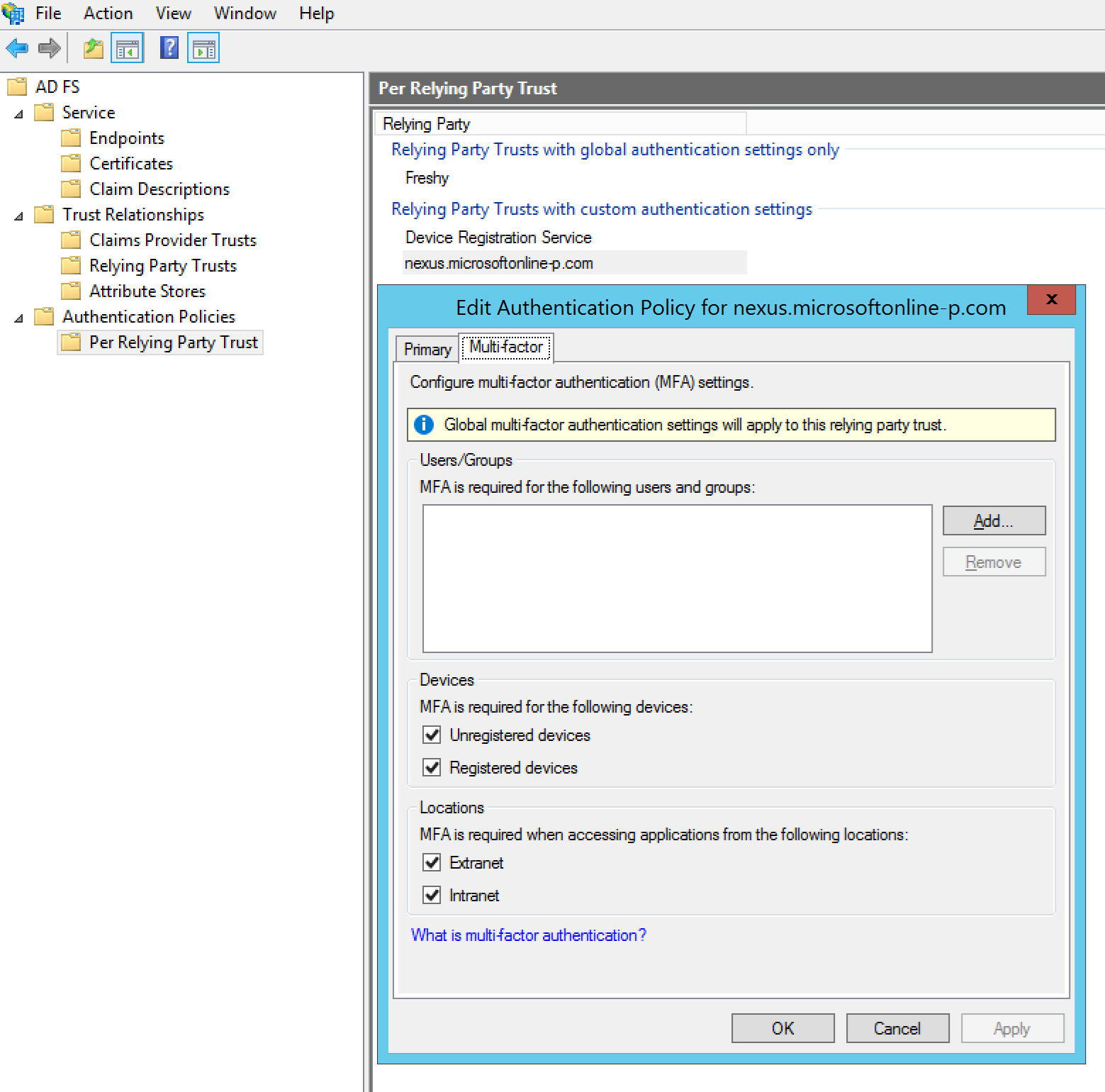 - Open AD FS Management and ensure the proper access policy is assigned for your Relying Party Trust (Recheck every step in Configuring MFA in the AD FS Manager).