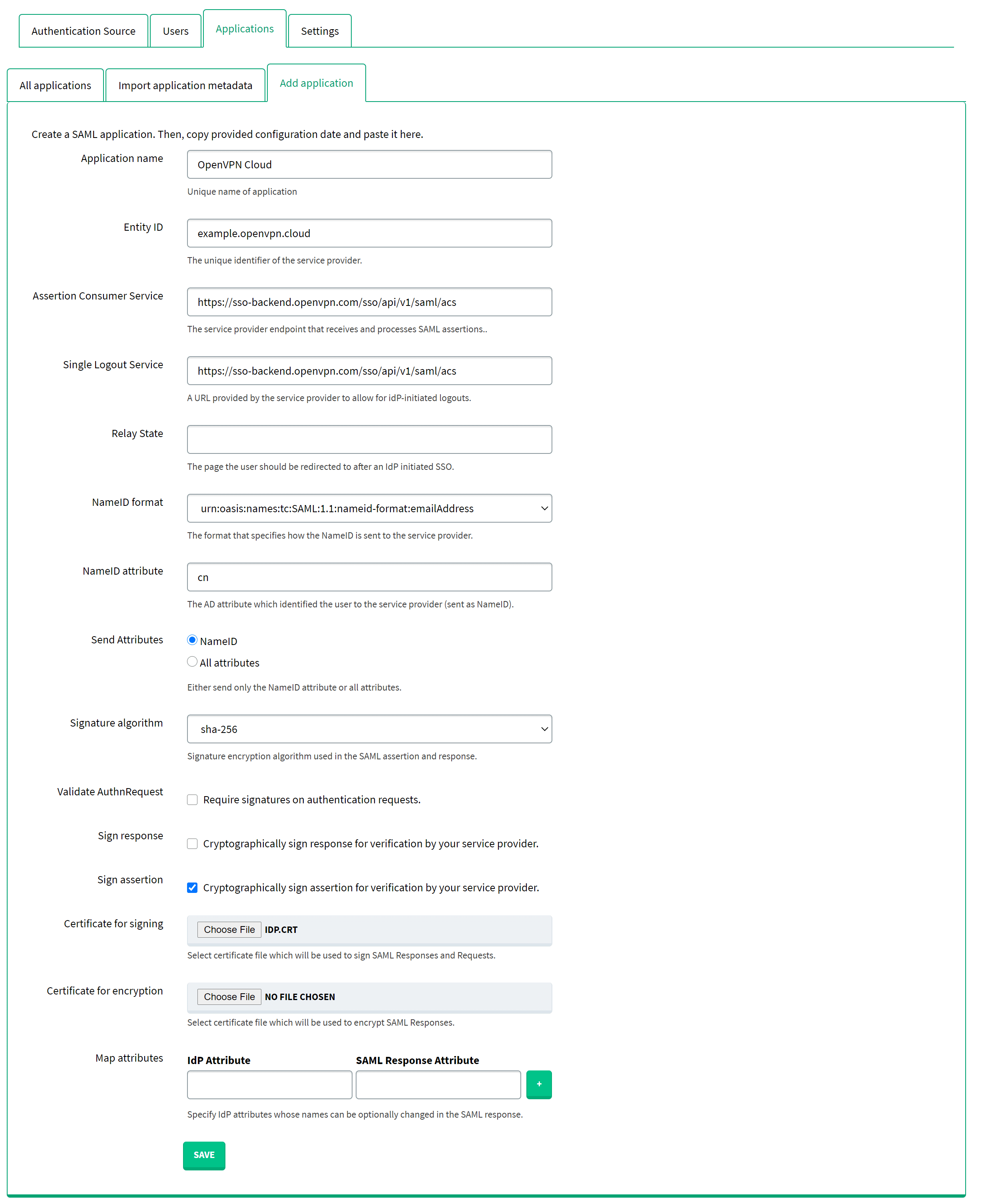 10. Get back to the OpenVPN admin panel. Open the XML metadata file you have downloaded and paste the contents of that metadata file in IdP Metadata XML.