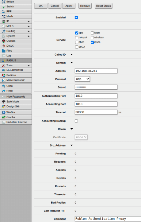 You need to install and configure Rublon Authentication Proxy itself before configuring MikroTik VPN to work with it. Read the Rublon Authentication Proxy and follow the steps in the Installation and Configuration sections. Afterward, follow the Configuration section in this document.