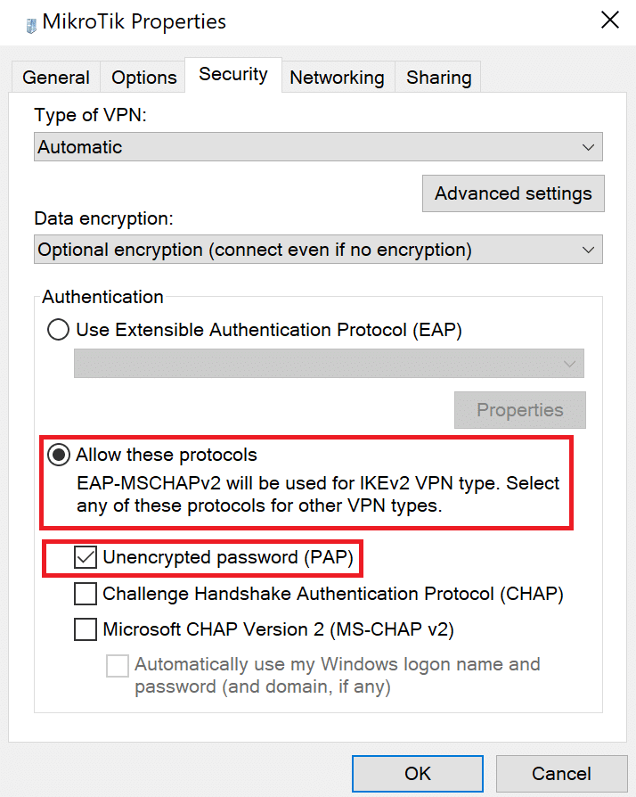 6. Select Allow these protocols and then check the Unencrypted password (PAP) checkbox.