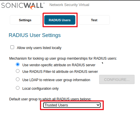 21. Set Default user group to which all RADIUS users belong. It has to be the same group as in the VPN server configuration (step 5).
