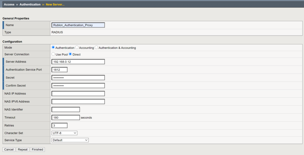 7. Set Server Address and Authentication Service Port. These are the IP address and port of your Rublon Authentication Proxy server.