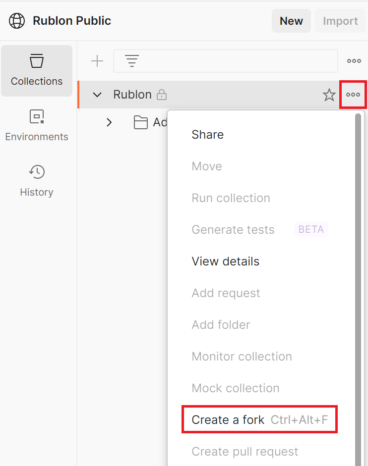 3. To fork the collection, go to Collections → Rublon, click the three dots in the Rublon collection, and then click Create a fork.