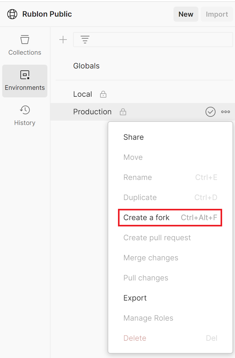 5. Open the Rublon Postman Collection again (not your workspace), go to Environments → Globals, click the three dots next to Production, and then click Create a fork.