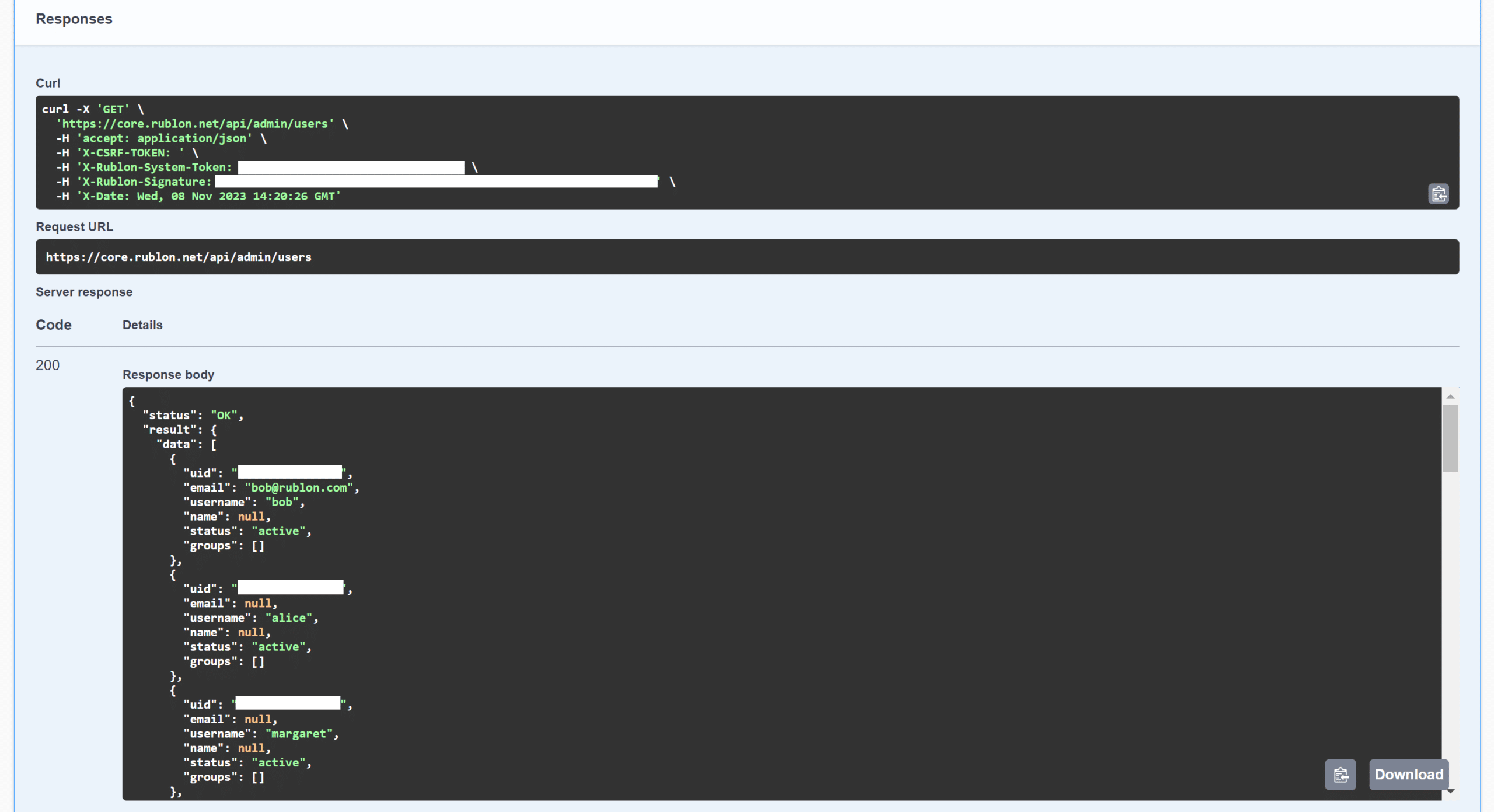 - To learn more about the possible responses and status codes, refer to the list of all endpoints at Rublon Admin API Endpoints.