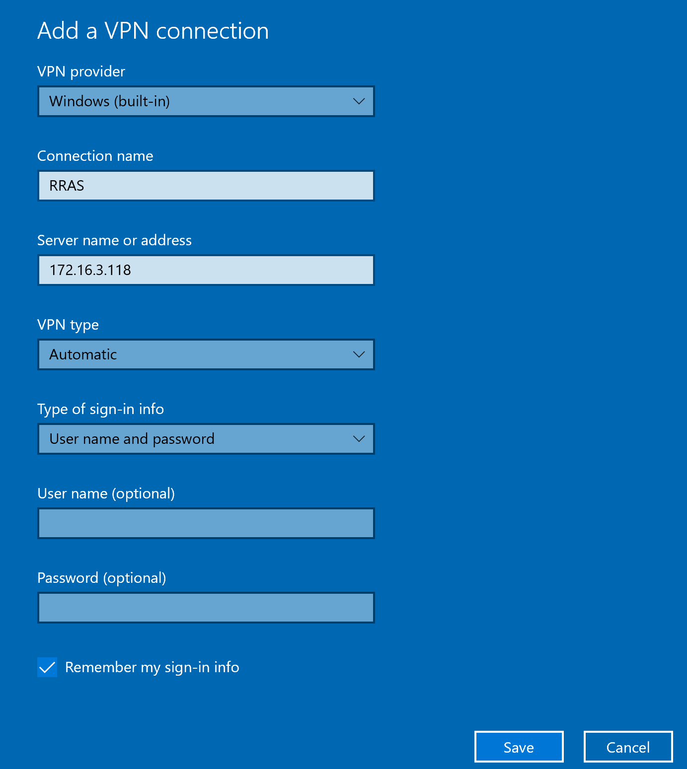 2. If you have not set user name and password while adding your VPN connection, a window will appear for you to provide your credentials. Provide your user name and password and click OK.