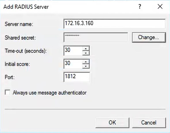7. Click OK to close the list of RADIUS servers and get back to your server’s properties.