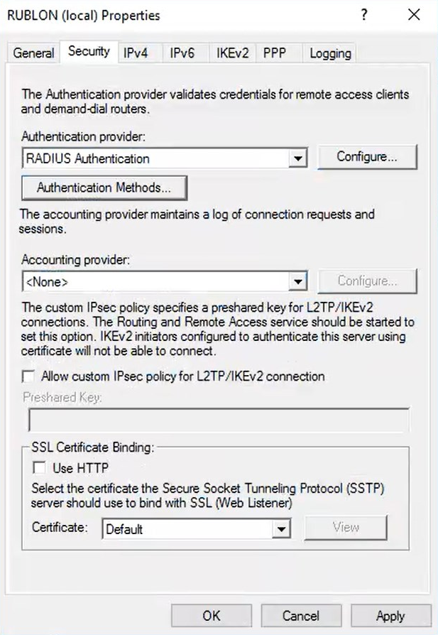 3. Go to the Security tab and locate Authentication provider. Select RADIUS Authentication from the drop-down list.