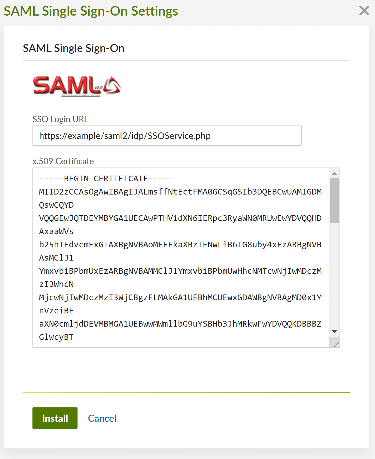 7. Click Install. You will be informed that SAML Single Sign-On was successfully installed.