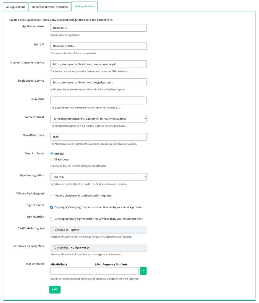 | Application name | Enter a name for the application, e.g. BambooHR. The name will be displayed during Rublon 2FA. |