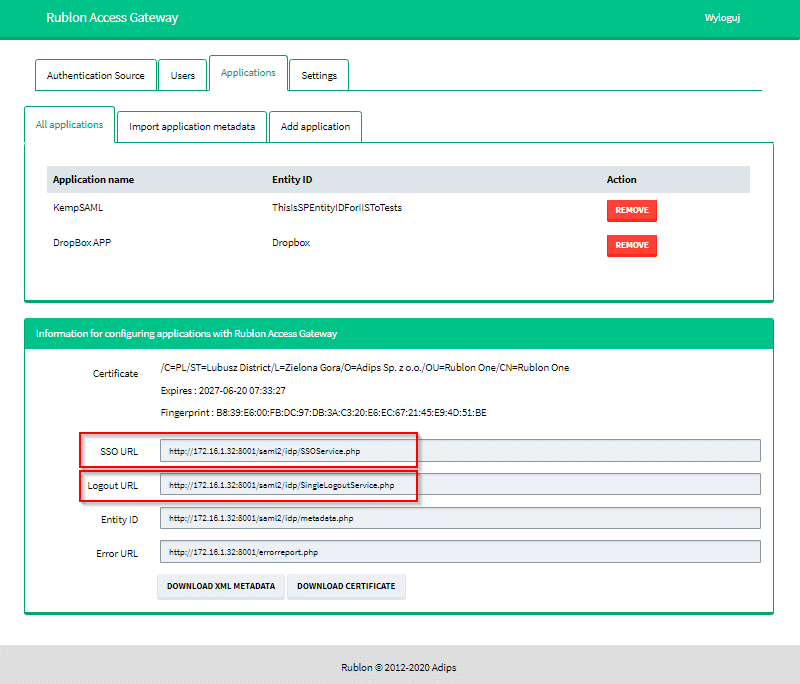 Optionally, you can also add Identity provider sign-out URL (optional), whose value can be taken from the Logout URL field situated right under the SSO URL field in Rublon Access Gateway.