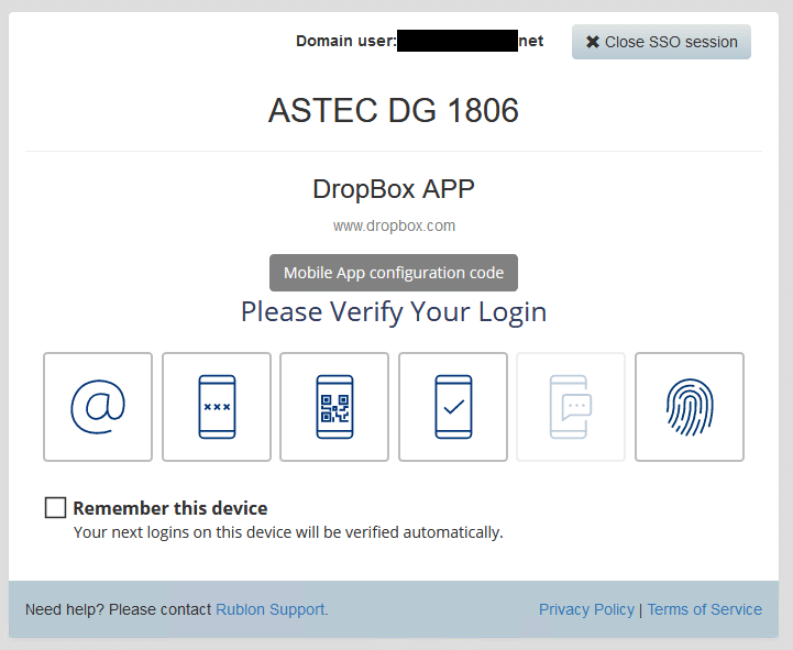 5. One of the options in the Rublon 2FA window is to Remember this device. Check it, and you will not be required to go through Rublon Authentication during your next login to Dropbox.