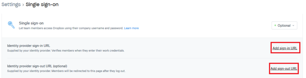 1. Log in to Dropbox as an admin, go to Admin console → Settings → Single sign-on, and select Optional or Required. Let’s choose Optional in this example.