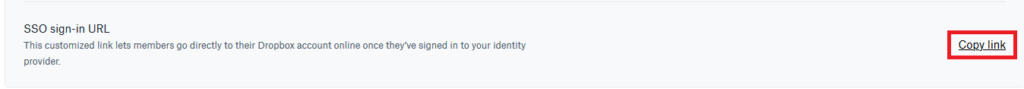6. Save your configuration in Dropbox by clicking Save at the bottom of the page, and copy the value of SSO sign-in URL as it will be used in the next section of this document to log in to Dropbox by SSO.