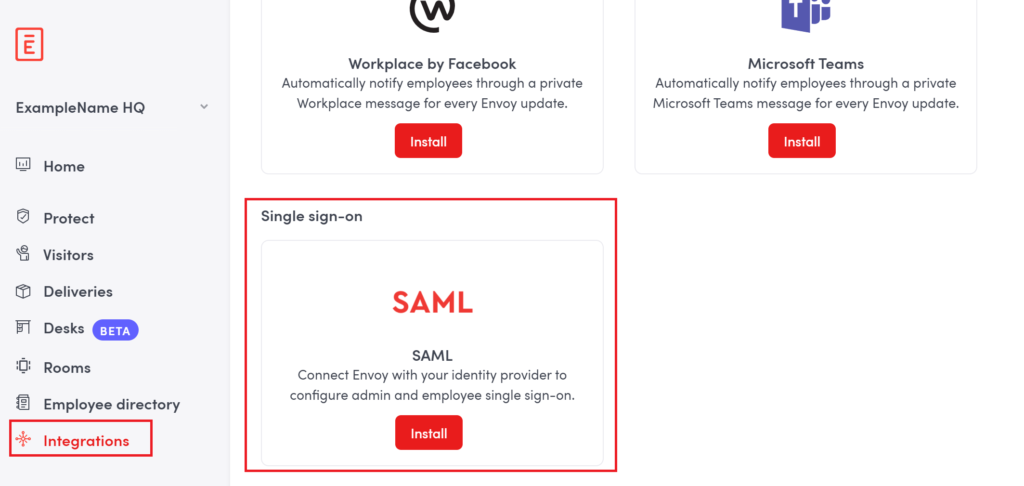 3. Navigate to Single sign-on and click the Install button inside the SAML tile.
