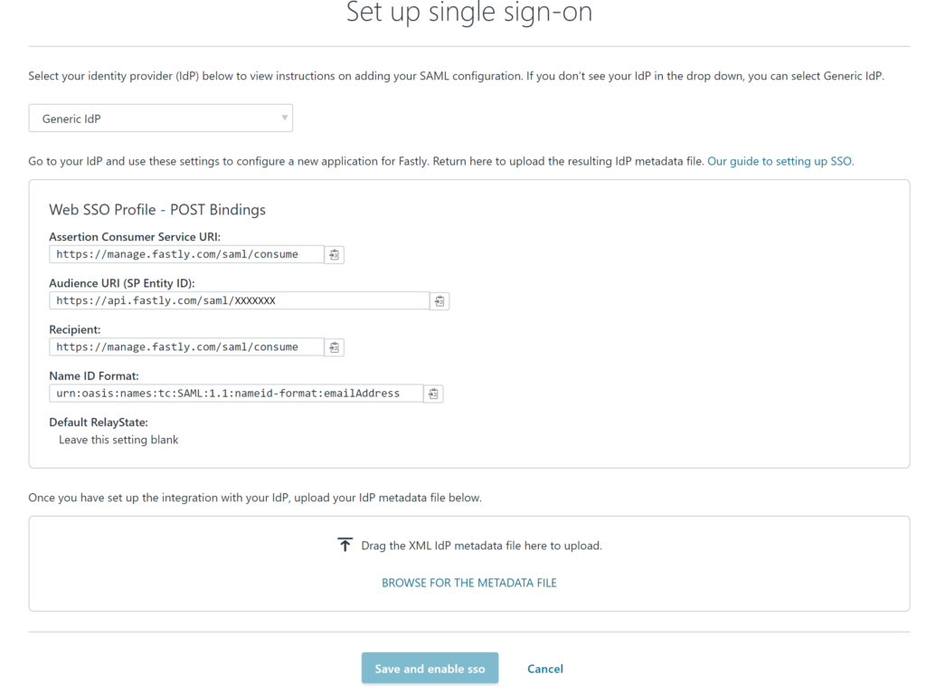 | Entity ID | Enter the value of the Audience URI (SP Entity ID) field from Fastly (Account → Single sign-on). |