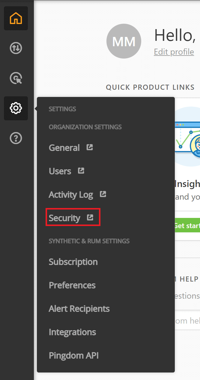 2. From the homepage of Pingdom, navigate to the left pane and go to Settings → Security.
