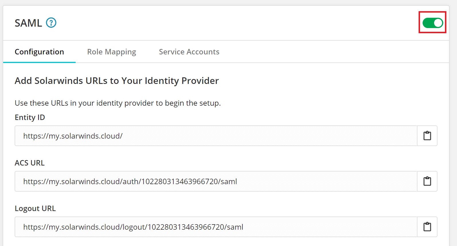4. Write down Solarwinds URLs (Entity ID, ACS URL, Logout URL). You are going to need these values when adding a new application to Rublon Access Gateway.