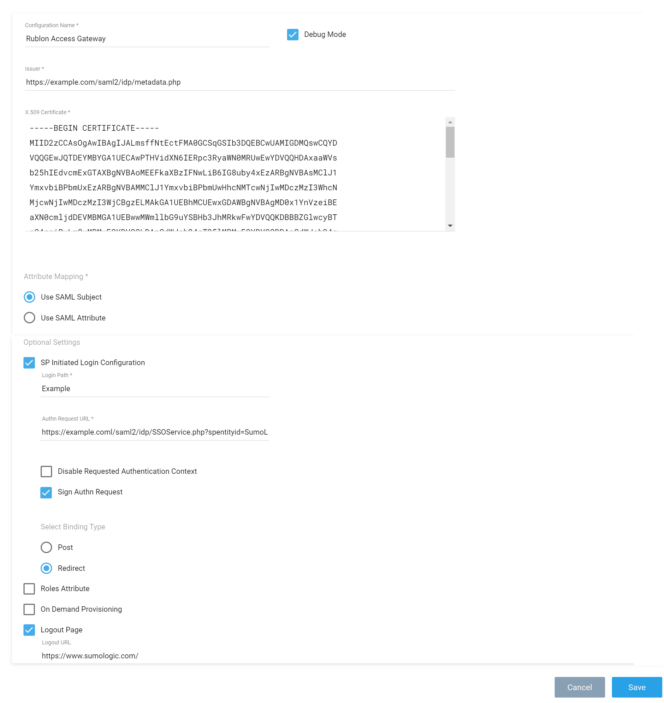 | Configuration Name | Enter a name for your configuration, e.g. Rublon Access Gateway. The name will be displayed on the Sumo Logic log in form. |