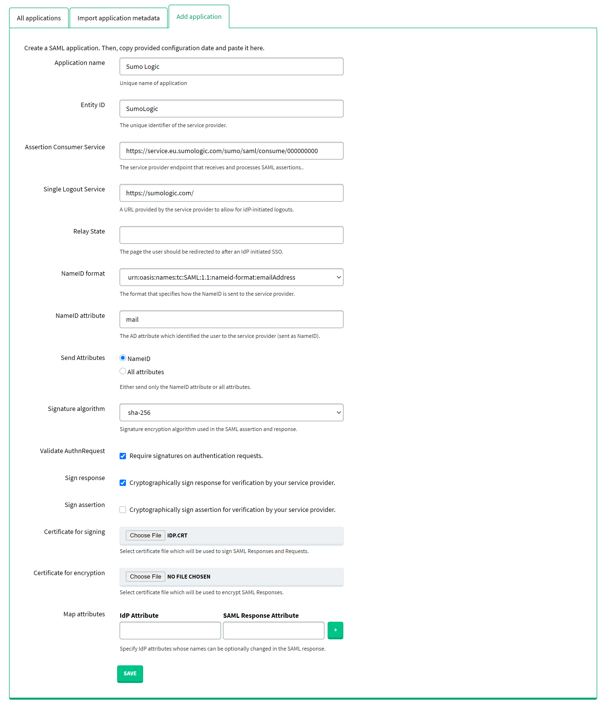 | Logout Page | Optional. Set to any any page of your choice, e.g. https://www.sumologic.com or leave out empty. |