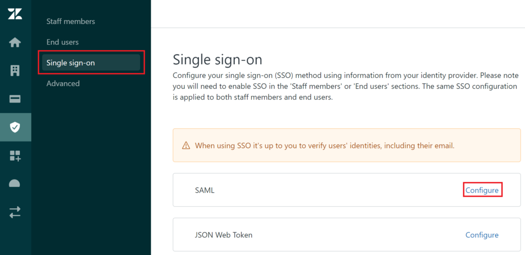 3. Select Single sign-on from the pane on the left and click Configure inside the SAML tile.