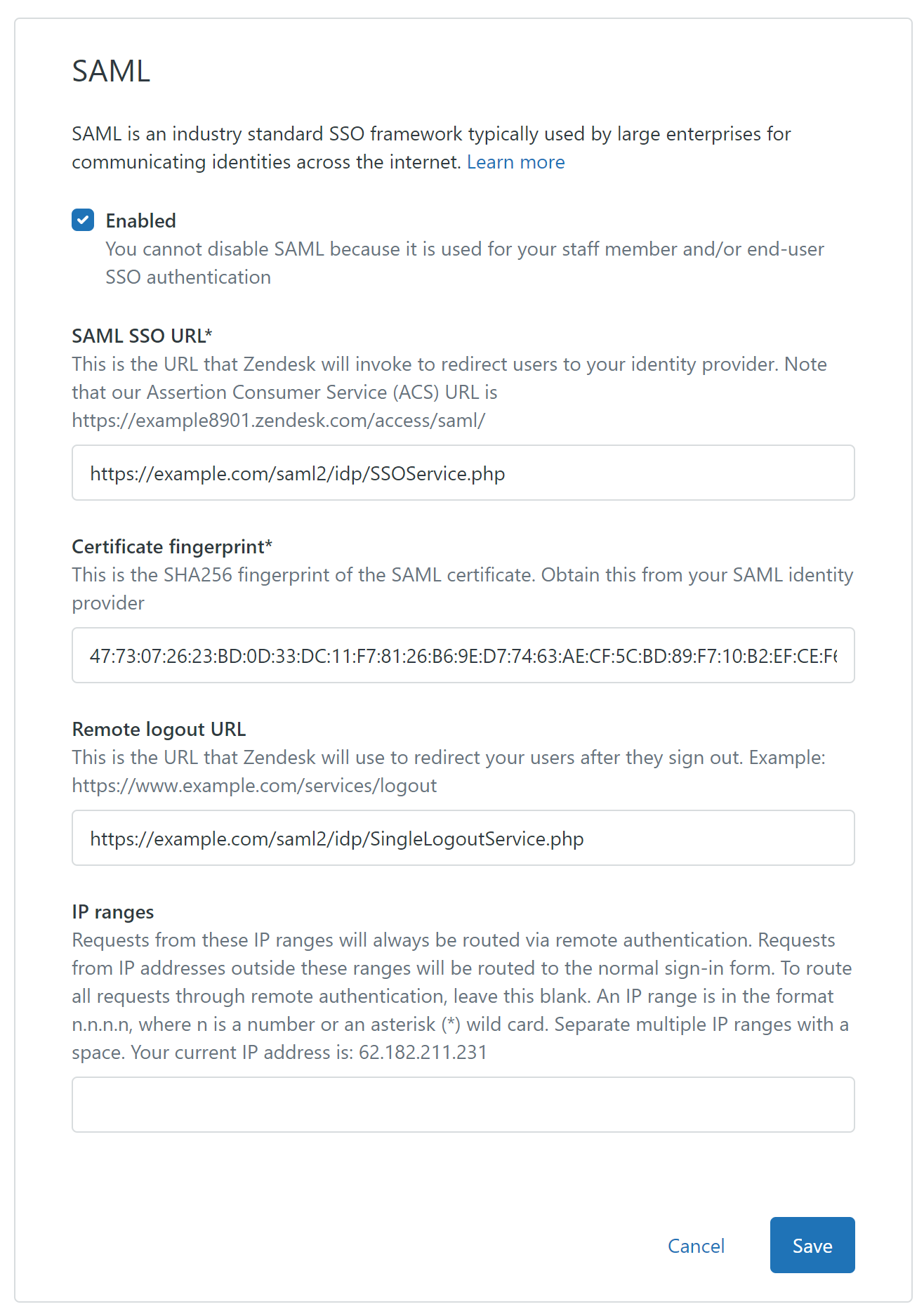 4. A SAML form will appear. Check Enabled and fill in the fields. Refer to the following image and table.