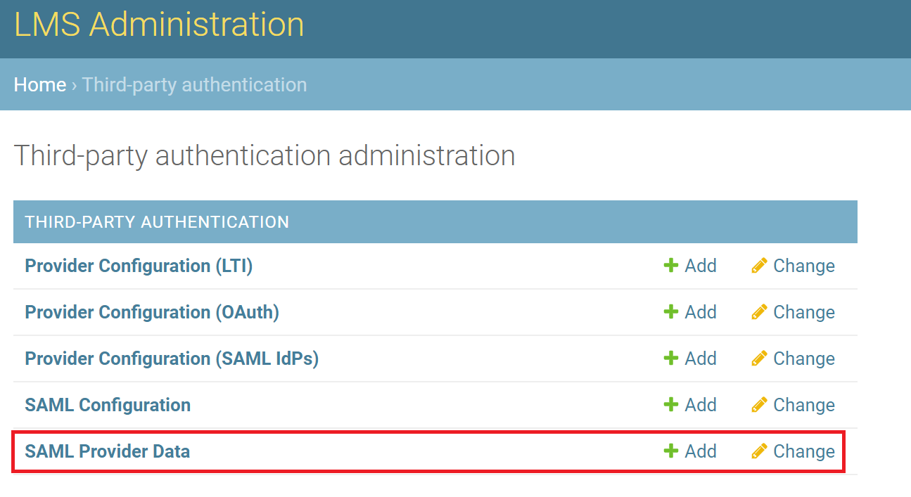 1. Go to Home → Third-party authentication → SAML Provider Data and click Add to add the provider data.