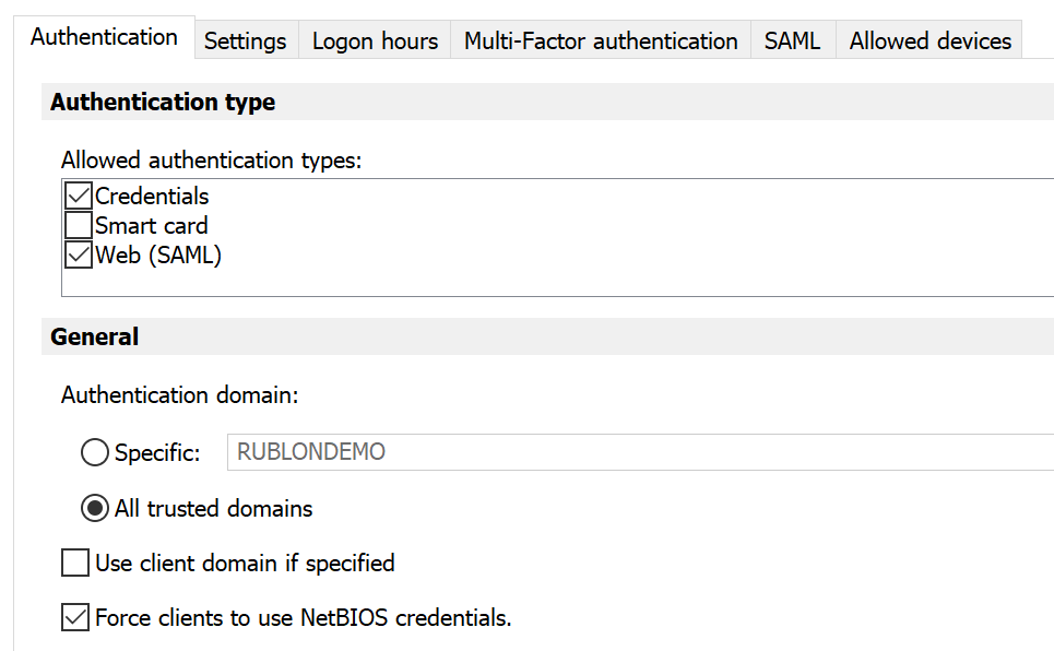 | Allowed authentication types | Check Credentials and Web (SAML). |