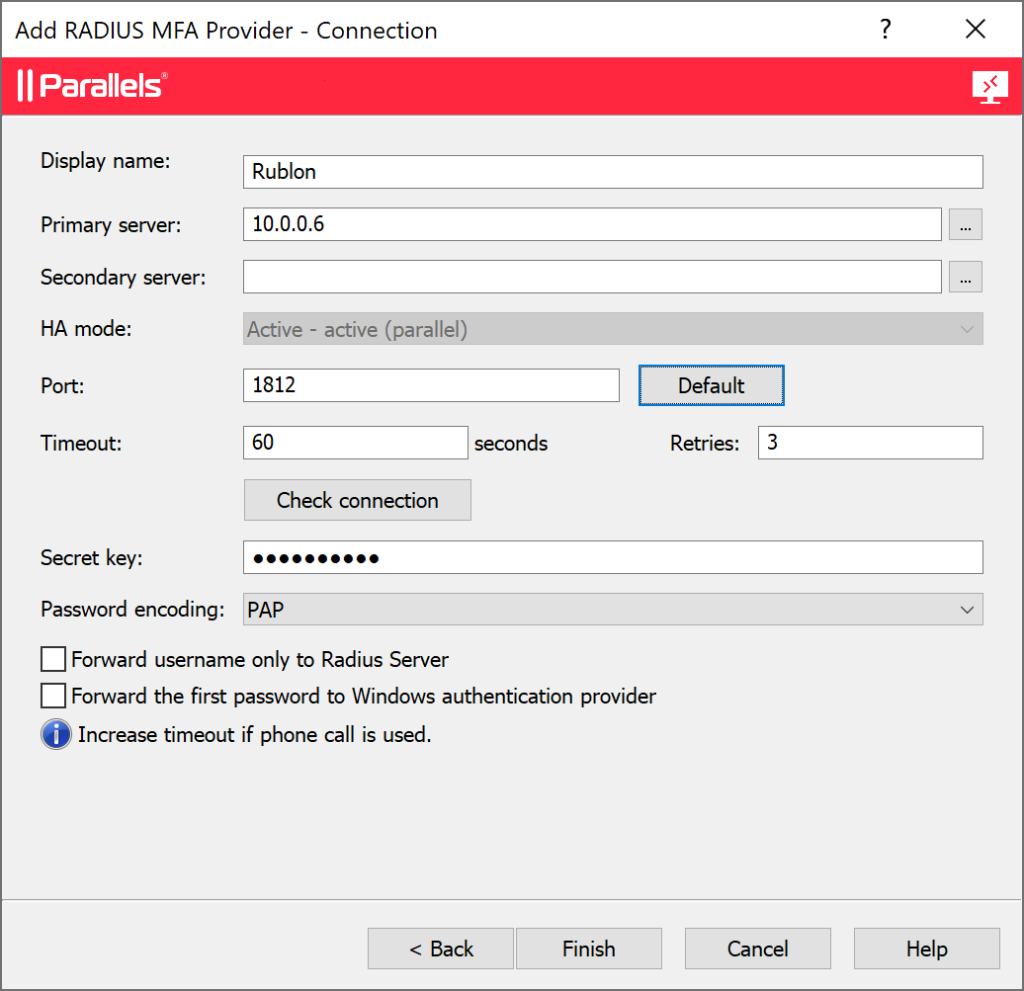 6. All other options are optional. Click Finish to save your RADIUS MFA provider configuration.