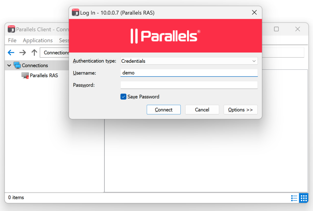 In this example, we assume you have already downloaded the Parallels client and added a connection in your Parallels Client.