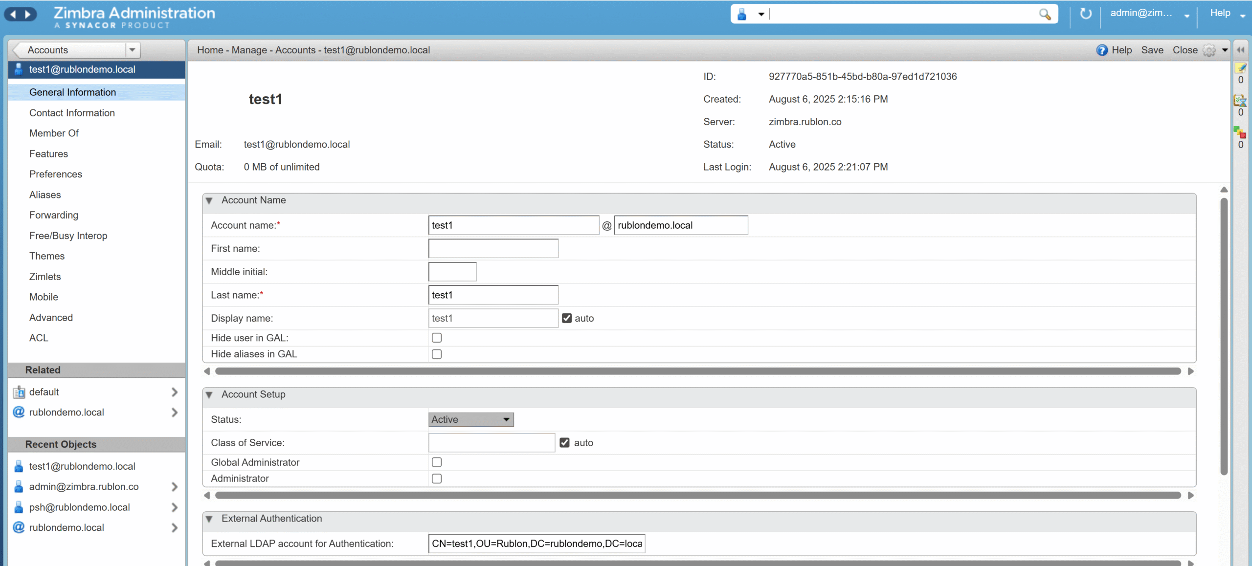 | Bind DN | The Bind DN (the full LDAP path of the service account, e.g., CN=rublonadmin,OU=Rublon,DC=rublondemo,DC=local) that Zimbra will use to authenticate and access the LDAP directory for querying user information. Note: This Bind DN must be the same as access_user_dn in your Rublon Auth Proxy’s config file. |