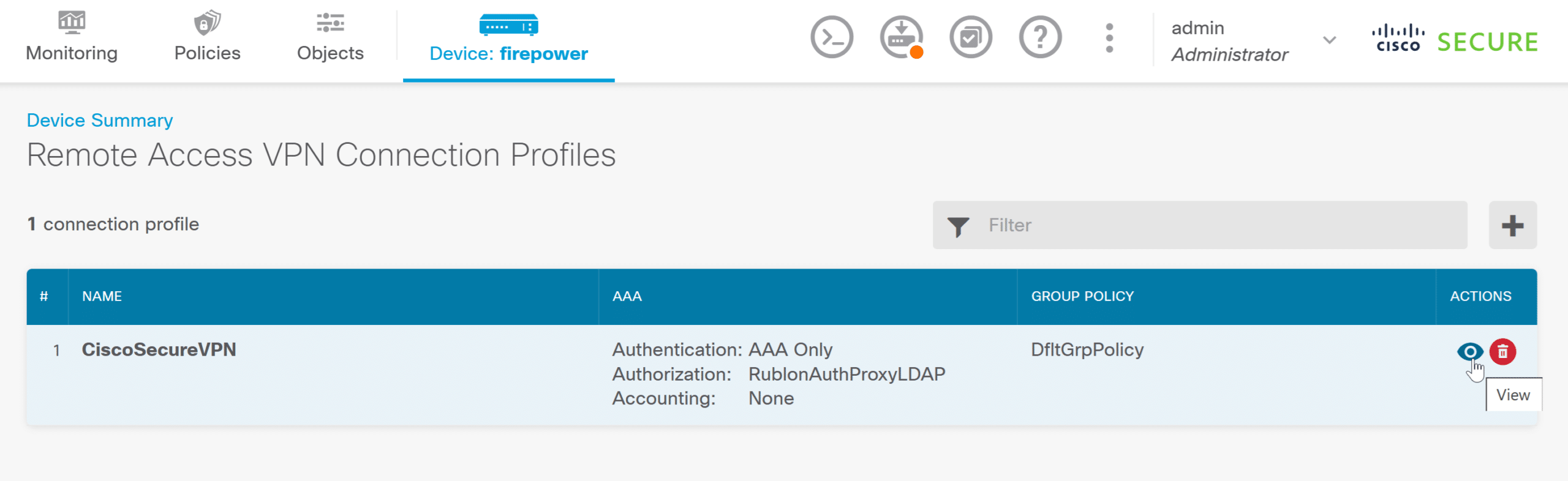 6. Now, you need to specify the new Identity Source in the Cisco Remote VPN configuration. From the top bar, select Device: <hostname> (where <hostname> is the name of your instance) and then select View Configuration in the Remote Access VPN section.