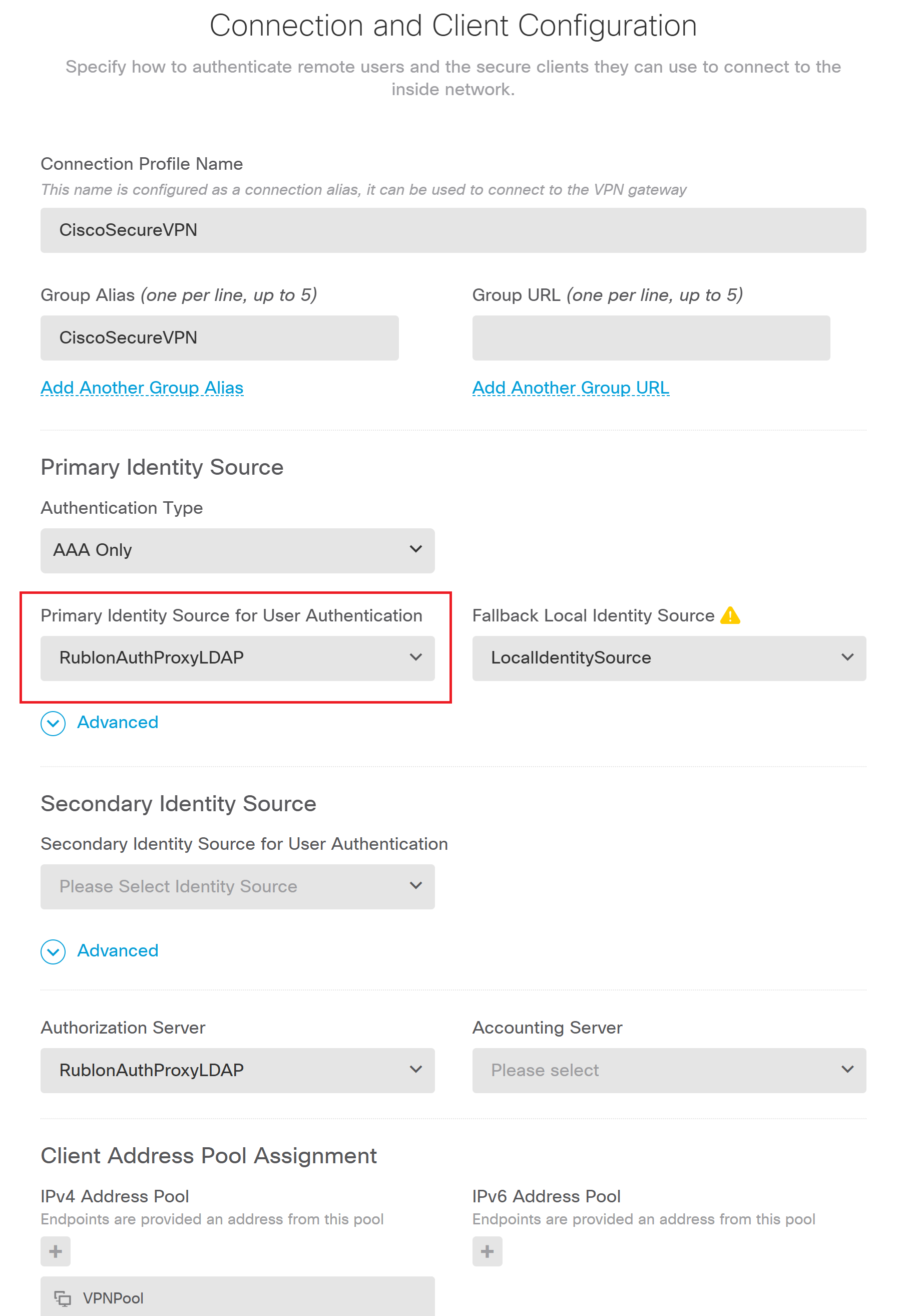 9. Add the Rublon Auth Proxy Identity Source under Primary Identity Source for User Authentication.