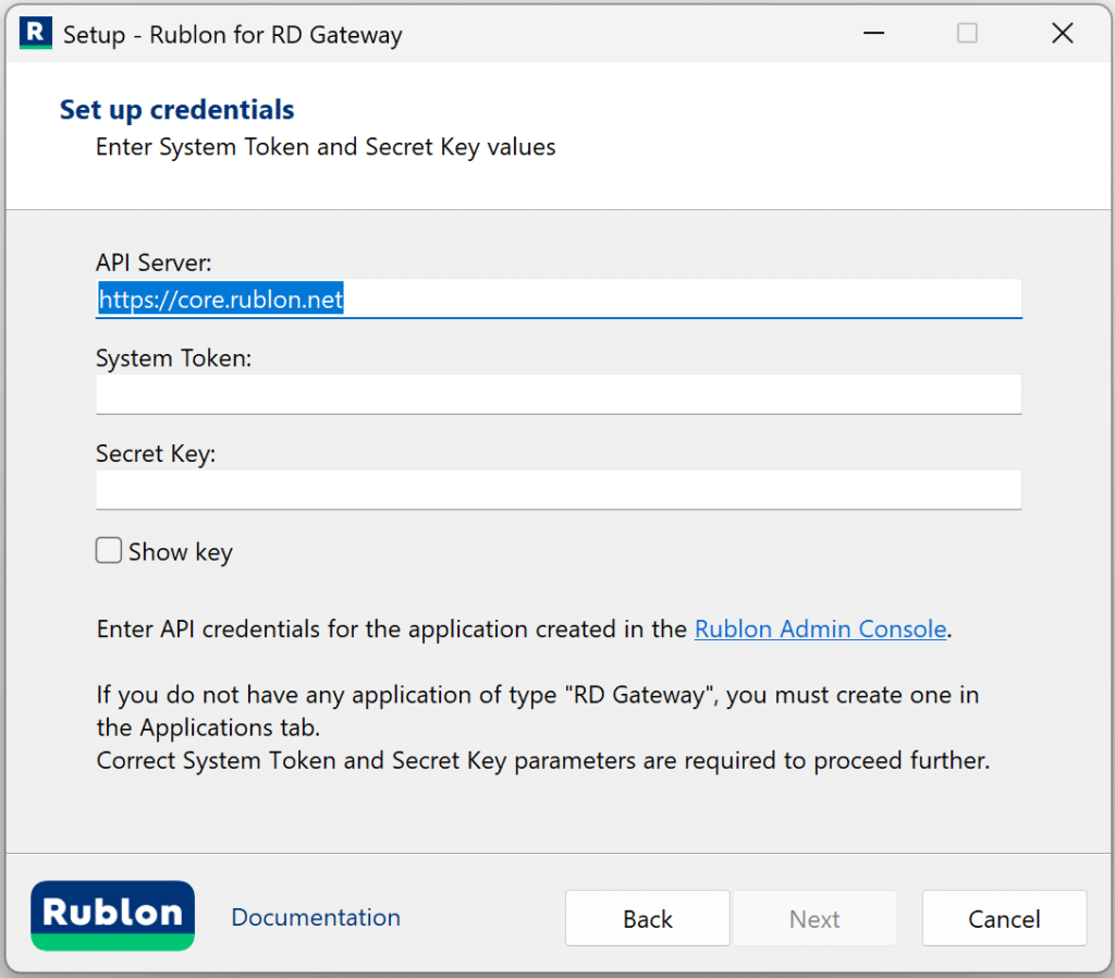 3. Enter the API credentials (System Token and Secret Key) from your application of type Remote Desktop Gateway in the Applications tab of the Rublon Admin Console and click Next.