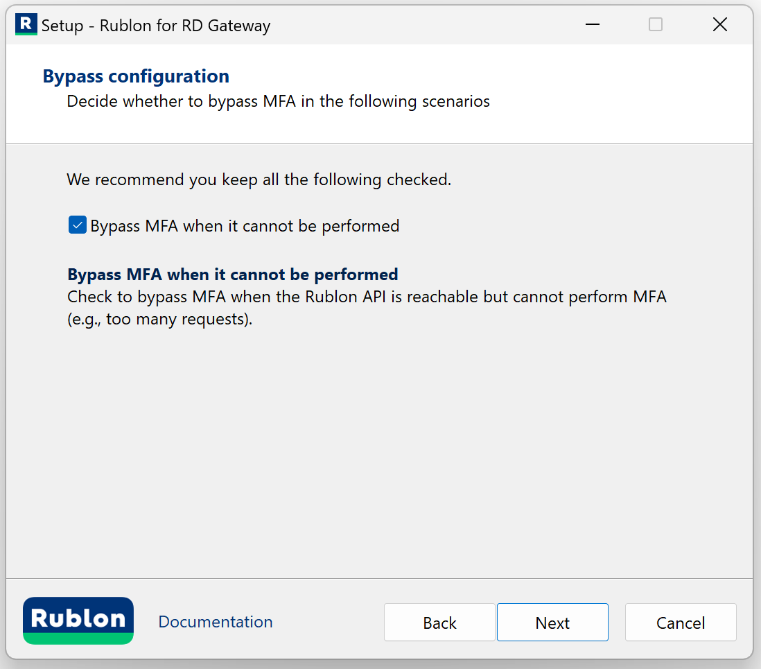 | Bypass MFA when it cannot be performed | Check to bypass MFA when the Rublon API is reachable but cannot perform MFA (e..g, too many requests). We recommend you keep this option checked if you’re installing Rublon for the first time so that you can access your machine in case of any issues (e.g., incorrect System Token/Secret Key or firewall blocks Rublon). |