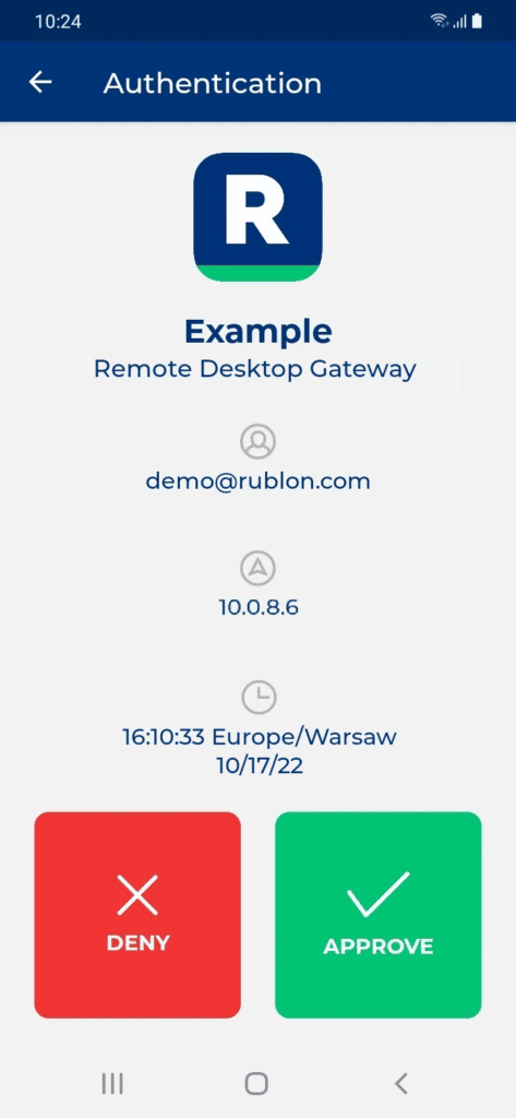 Multi-Factor Authentication (MFA) for Remote Desktop Gateway is a secure extra layer of authentication for Microsoft Remote Desktop Gateway logons. During the authentication process, Rublon sends a Mobile Push login request to the user if they have the Rublon Authenticator app installed. Apart from the Mobile Push authentication method, Email Link, Phone Call, and SMS Link can also be used. Users who do not complete the Two-Factor Authentication process are denied access.