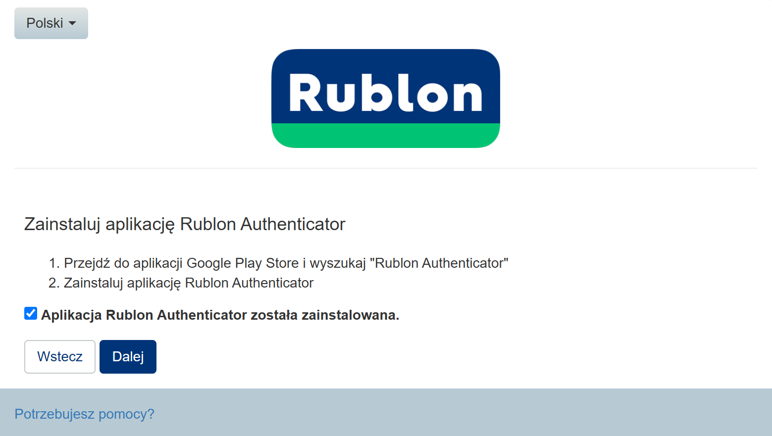 3. Jeśli aplikacja mobilna Rublon Authenticator nie jest jeszcze zainstalowana na Twoim urządzeniu mobilnym, zainstaluj ją. Następnie, zaznacz pole wyboru Aplikacja Rublon Authenticator została zainstalowana. i kliknij Dalej.