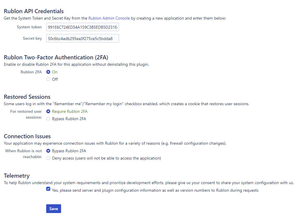 - Rublon API Credentials – use the same credentials as the ones created in the Rublon Admin Console application. You can find the description of options available in the Rublon Jira MFA Plugin in the list below.