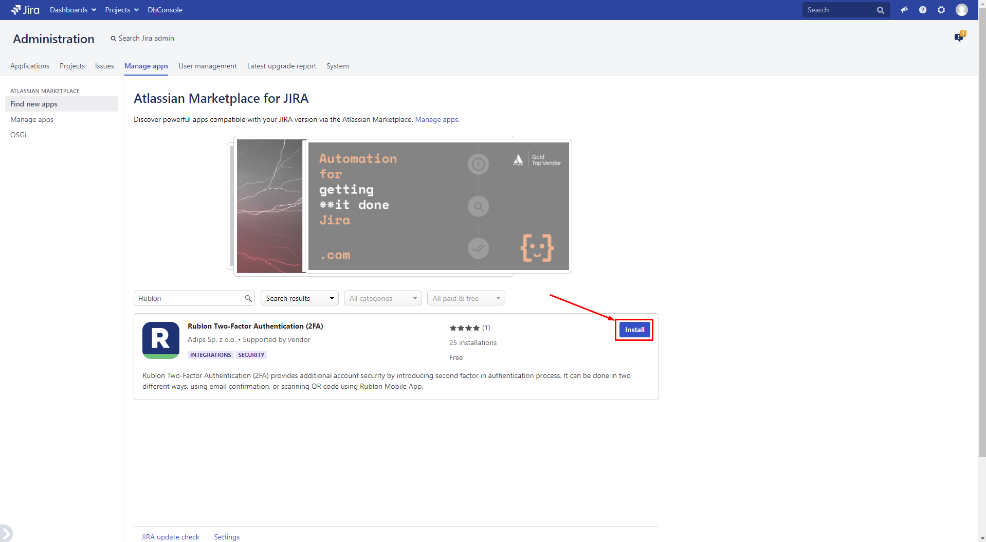 3. Search for “Rublon” in the Find new apps tab, and click the Install button, as shown in the image below.